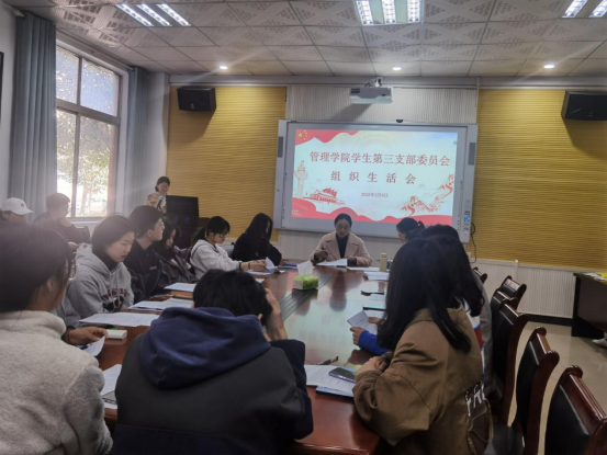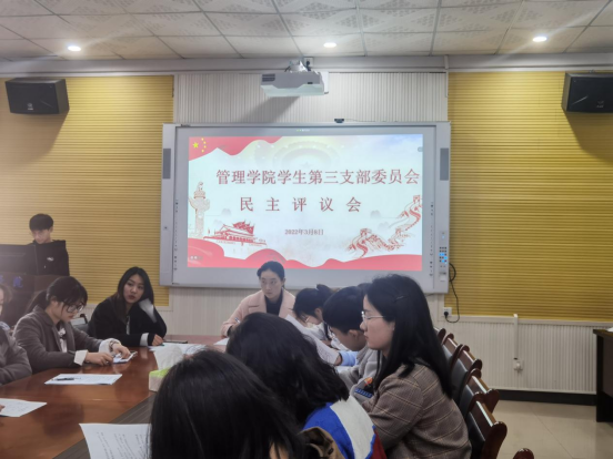 3月8日中午12:30,管理学院学生第三支部委员会全体党员在F104会议室组织召开了组织生活会和民主评议会。管理学院党委委员、副院长潘立军、支部全体党员参会,会议由学生第三支部书记陈祎婷主持。