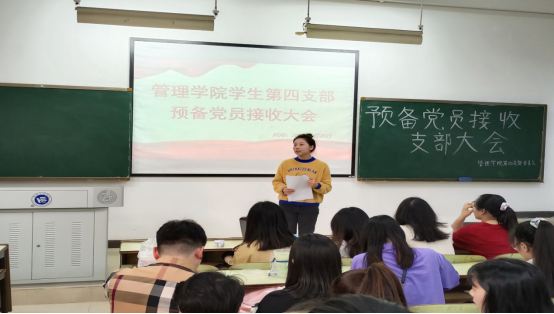 为壮大支部党员队伍,增强党支部力量,0638太阳集团官网管理学院学生第四支部于2022年5月20日在B106召开接收预备党员的支部大会。参会人员包括全体正式党员和预备党员,此次会议由支部书记陈景楠主持。