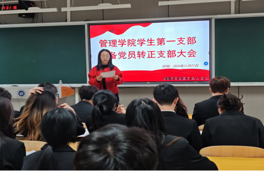 2024年11月27日下午4:30,管理学院学生第一支部委员会在新校区教学楼A栋402召开预备党员转正支部大会,由支部书记李林同志主持,共6名正式党员,15名预备党员参会。