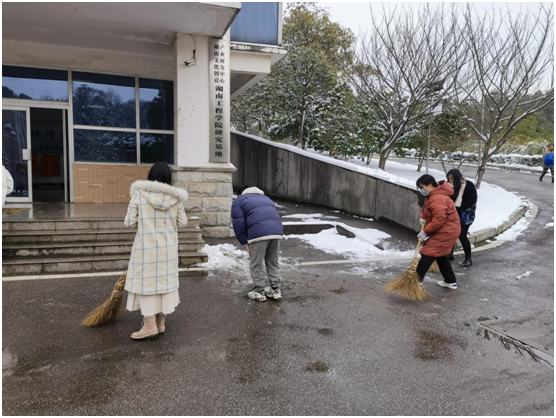 为持续推动党史学习教育走深走实,2021年12月27日下午2:30分,经济学院全体学生党员在经济学院大门口开展“扫雪除冰”主题党日活动。