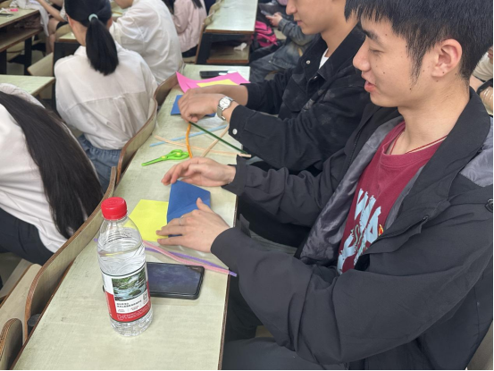 活动中,学生党员通过“留言寄情”“扭棒制作”“剪纸传梦”三大环节深化对教育公平与感恩回馈的理解。在“留言寄情”环节,参加活动的党员和青年学生结合自身受助经历,深刻阐述资助政策对推动教育公平的重要意义,抒发对社会的感恩之情与回馈之志,学生党员梁宇航写道:“资助政策不仅是雪中送炭,更让我明白党员应成为传递温暖的桥梁。”随后,在工作人员的指导下,党员们分组创作主题手工艺品,用扭棒编织象征“助学纽带”的立体造型,将感恩之情融入作品。各小组在制作过程中相互协作,分享创作理念,现场氛围热烈。