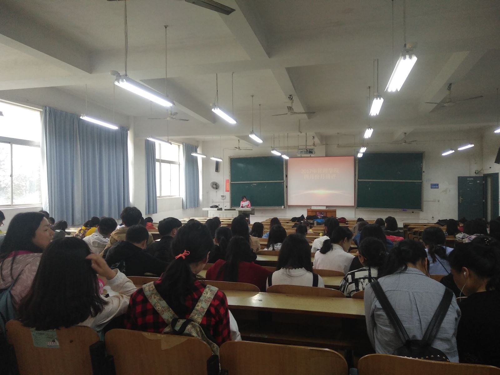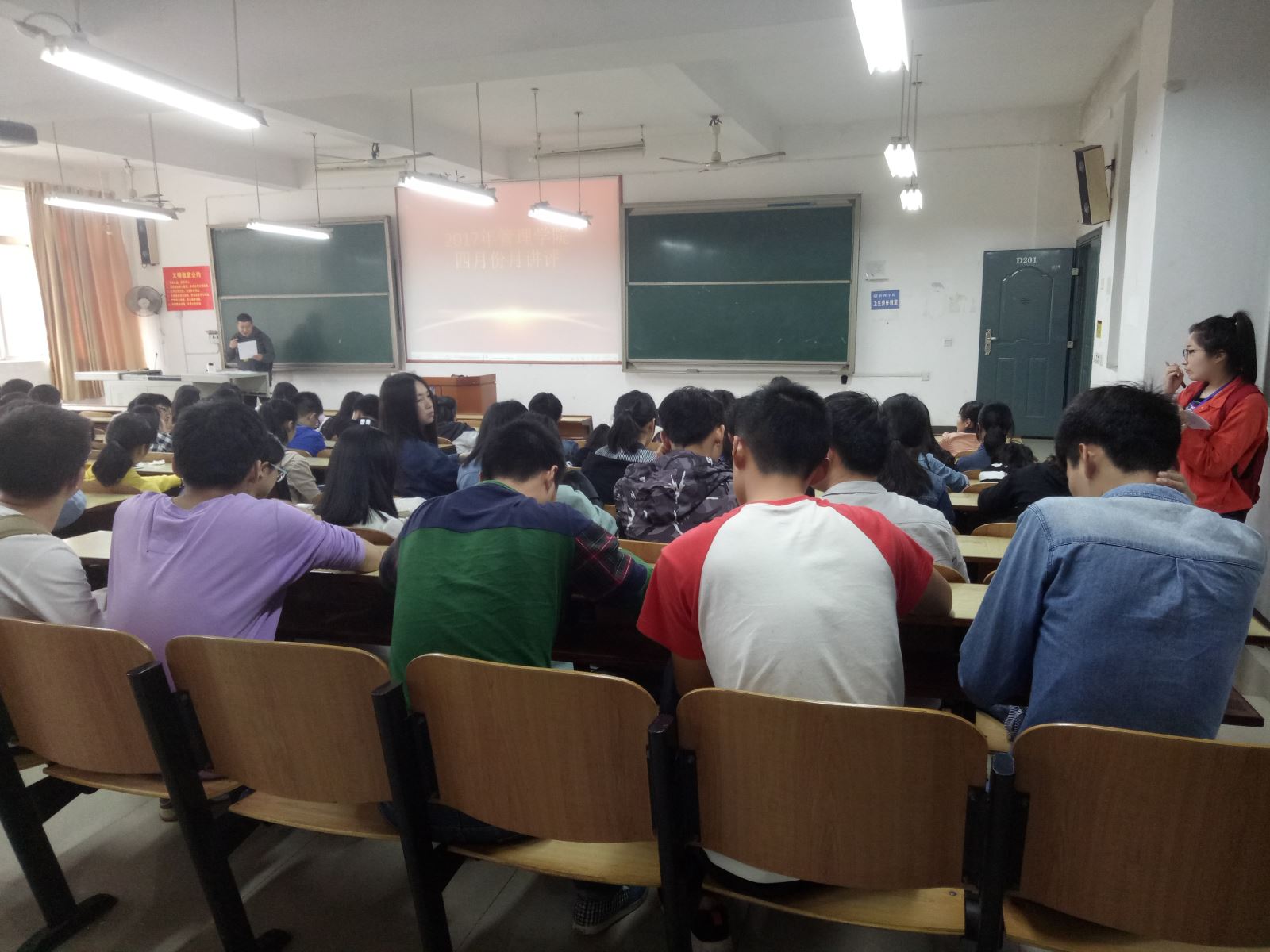 2017年4月17中午12:20,管理学院工商管理、会计、旅游管理双学号、物流、人力、市营全体人员,在主校区教室内进行本学年四月份月评会议。学办辅导老师黎博、单艳艳、包海燕、周艺、宋志航对工商管理、旅游管理、人力资源管理、会计学、物流管理六个专业进行月讲评,本月心理会议也同月评会同一时间顺利展开。