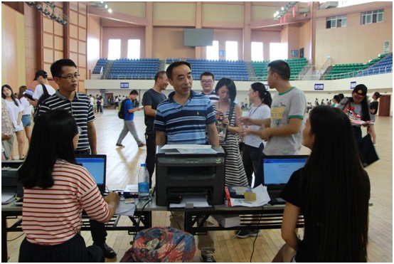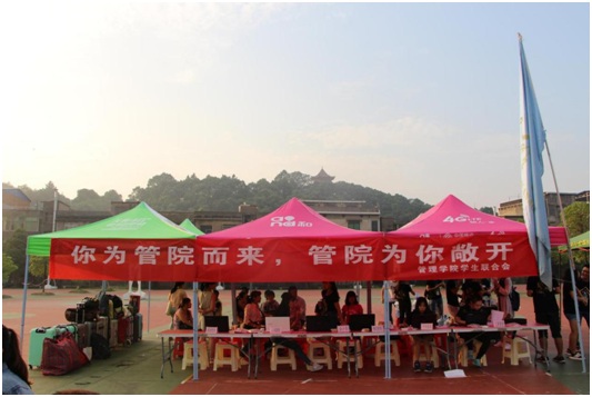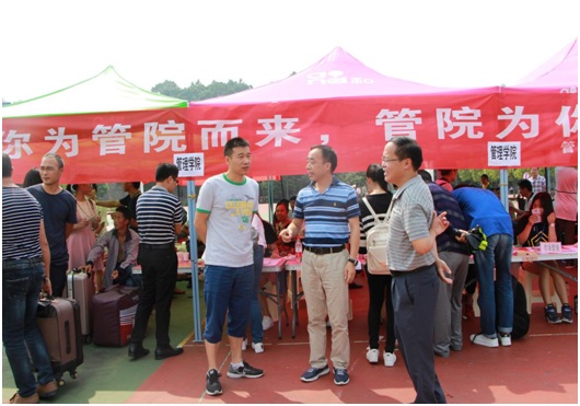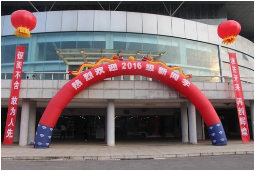 校园被妆点得分外美丽,喜庆和谐。彩虹门上书写着“热烈欢迎2016级新同学”,校园体育馆主干道上高挂着红色迎新横幅,缤纷的院旗和整齐的帐篷,使迎新现场变得既有声有色又井然有序。截止9月9日下午5点,管理学院已报到新生433人,报到率96.22%。