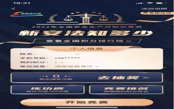 本次活动全程在线上进行,每天可进行一次答题挑战。活动期间可每日在练功房中进行练习,提高竞赛答题的正确率。答题完成后还设置抽奖环节,可在抽奖界面进行具体操作,有效地提高师生答题的积极性。在活动首页将显示竞赛排名,可查看该用户累计积分的当日排名并分享,并支持切换日期查看往期排名,最终以排名确立晋级名单。