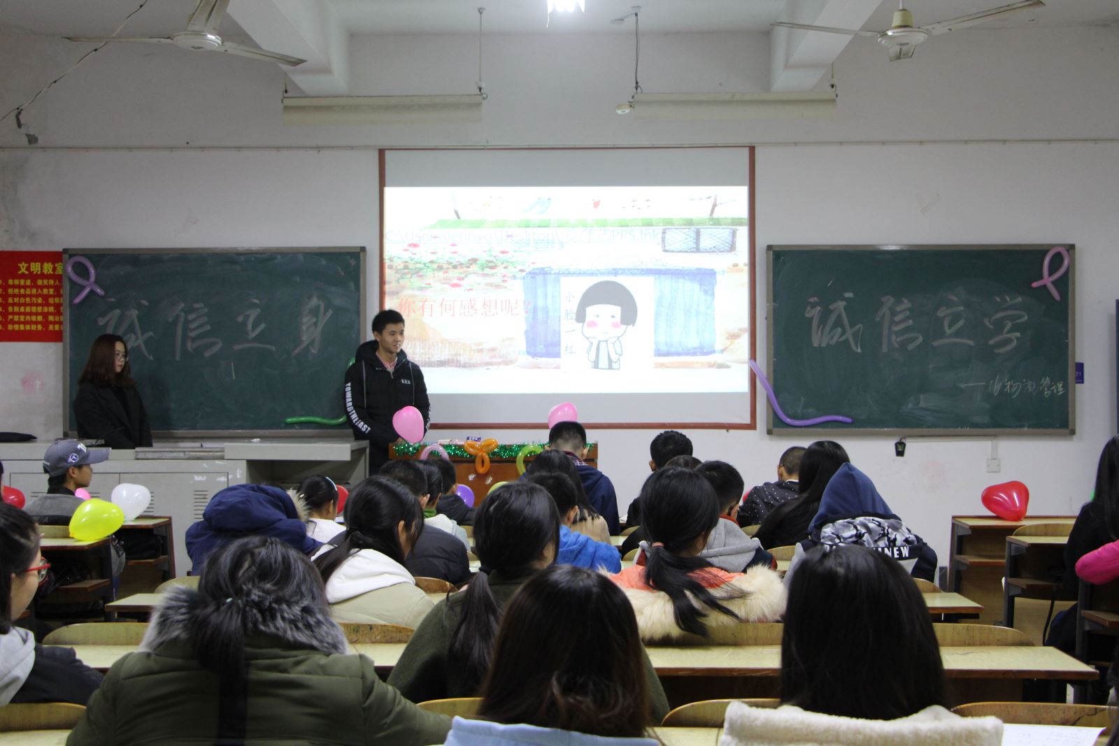 阳光正好,0638太阳集团官网学院管理学院各专业班级于2017年11月28日晚上7点举办了主题为“诚信立身,诚信立学”的班会,班会主要由班委负责,全体同学参加。