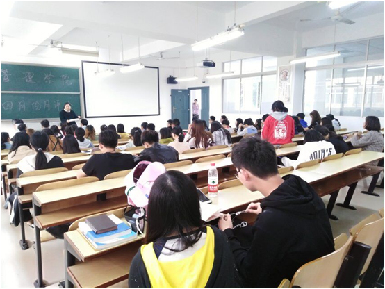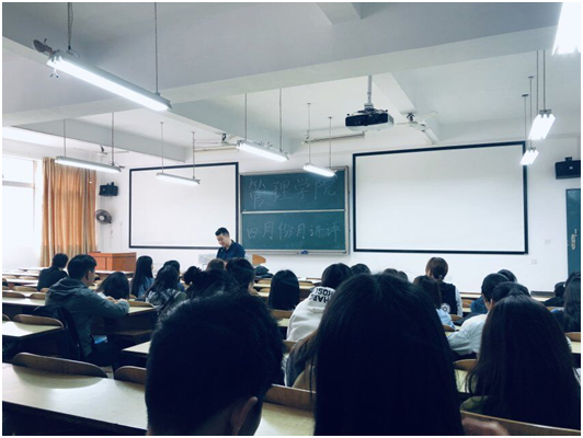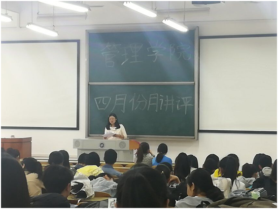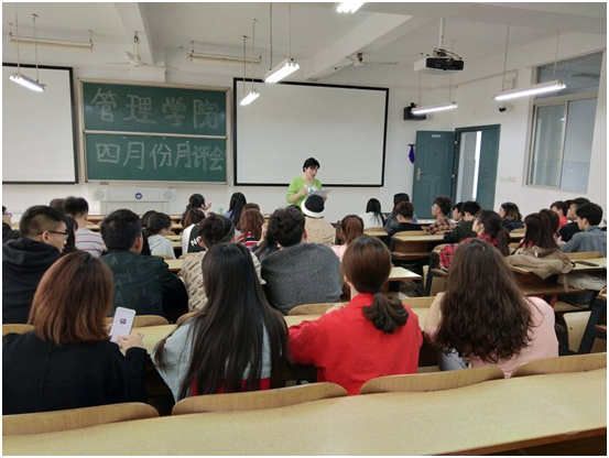 2019年4月23日中午12:10,管理学院大一大二大三大四全体班委和寝室长,在主校区教室内进行本学期第二次月评会议。学办辅导老师罗荃、黎博、单艳艳、包海燕、周艺、宋志航对工商管理、电子商务、旅游管理、人力资源管理、会计学、物流管理、市场营销七个专业进行了讲评。