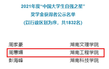 “这次获评‘中国大学生自强之星’是对我过往努力的肯定,但是我深知未来的道路还很长,需要我不断奋斗。我会继续脚踏实地、担当作为,做一名优秀的湖工学子。”周蕙媚表示。