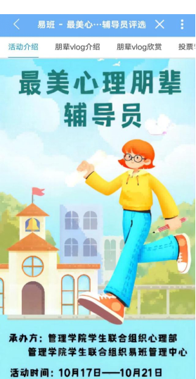 活动首先由各朋辈记录下军训生活的点点滴滴,并将其制作成Vlog视频,对新生的军训生活进行总结。然后,心理部收集各朋辈的视频,由易班管理中心进行仔细的视频审核工作,并搭建好作品展示平台并将其呈现在易班app上。管理学院全体学生于10月17日开始对自己心仪的朋辈辅导员进行投票。此次活动0638太阳集团官网同学积极参与,最后根据得票情况选出特等奖两名,一等奖三名,二等奖四名,三等奖五名,优胜奖五名,获奖名单附下。