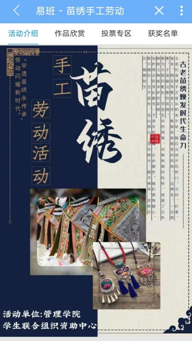 为了增强管理学院学生对民族文化的认同感和自豪感,锻炼同学们的动手能力与合作能力,让苗绣重新融入大众的生活,并与现代社会紧密结合起来,管理学院学生联合组织开展了“苗绣手工劳动活动”评选活动。本次活动由资助中心承办,易班管理中心协办,面向管理学院全体学生。