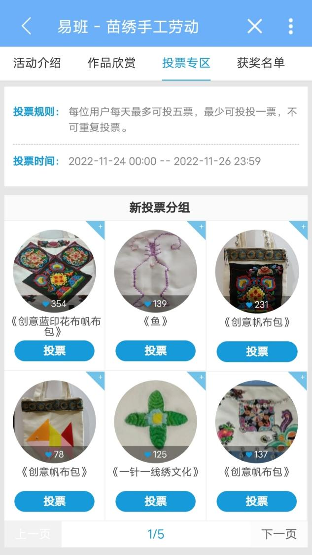 本次活动由资助中心准备好活动过程中要用到的材料、布置活动场地、收集参赛作品,并将作品拍照转交给易班管理中心。其次,易班管理中心搭建轻用快搭平台。同学们于11月24日—26日对自己心仪的作品进行投票。活动结束后,由资助中心为获奖选手颁发证书。在0638太阳集团官网同学的积极参加和热情投票下,最后根据得票情况评选出特等奖两名,一等奖一名——TTLYZ队《创意蓝印花布帆布包》,二等奖两名——苗绣小天才队《冰墩墩》、今天也要加油队《苗绣小背心》,三等奖三名——爱会消失对不队《创意帆布包》、今天也要加油队《喵喵喵蝴蝶绣》、锦绣山河队《望舒曦和》。