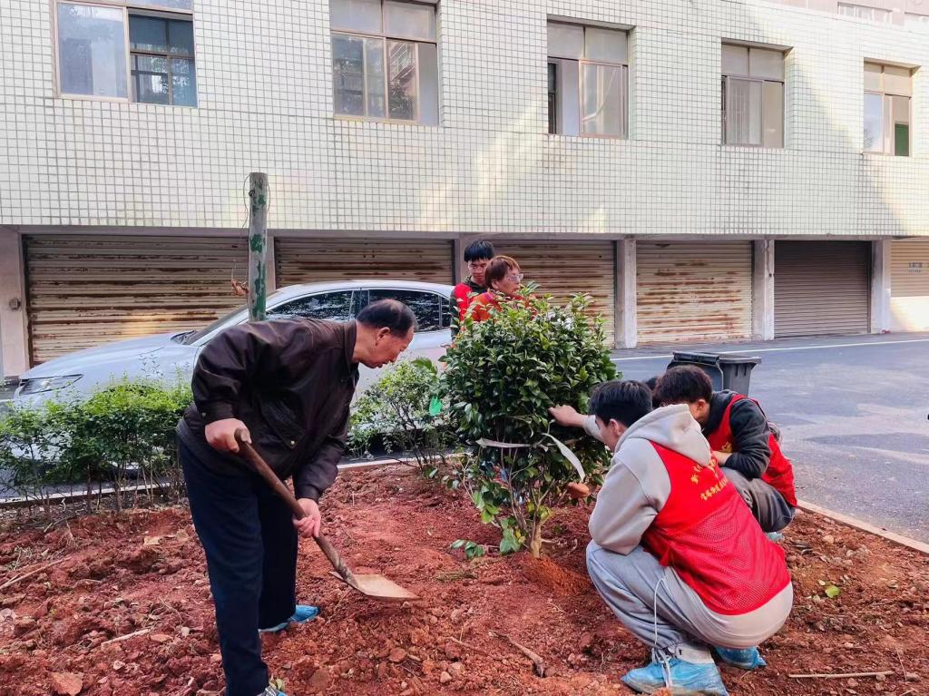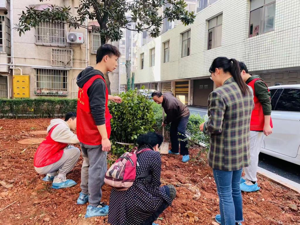 3月9日晚,参加活动的13名志愿者于主校区F104集中学习了党的十八大以来习近平总书记关于生态文明建设的重要论述,并利用网络资源,了解了植树的基本操作。3月10日上午,志愿者们前往交警小区,在社区工作人员和小区植树爱好者的带领下开展植树活动。大家分工协作,挖坑铲土、扶苗培土、干劲十足。“这是三角梅,你们家小区里应该也经常见到吧,就是那些开紫色花的,11月前后一团团、一簇簇的花都开了,可美了,到时候叫你们来赏花!”指导志愿者们植树的姜云足爷爷热情地介绍着。
