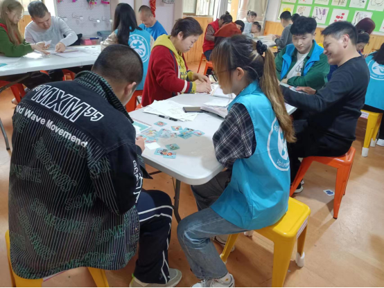 志愿者们先是打扫了园内的枯枝落叶,紧接着与亲园伙伴们进行了一些有趣的活动,比如双方配合传球等,这些活动加深了志愿者们与亲园伙伴们的心灵交流与联系。亲园伙伴们搬来椅子坐在志愿者们旁边,与他们进行交谈,志愿者们在一旁辅导他们进行贴绘本活动,不仅要贴对,还要贴整齐,这有利于提高他们的专注力和耐心程度。