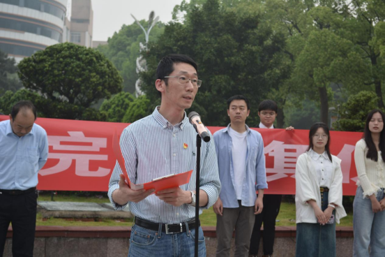 为厚植青年学子爱党爱国情怀,培养担当民族复兴大任的新人,引导大学生筑牢思想之基,4月22日,管理学院于主校区知行广场举行升旗仪式。学院党委书记文山东、党委副书记谭超和学生工作办公室主任黎博出席,全体辅导员及2022、2023级全体学生参加,仪式由党委副书记谭超主持。