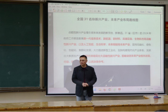徐运保介绍了管理学院基本情况和人才培养成效,并以某网站界面的介绍为切入点,以经济的眼光畅谈中国经济产业布局。徐运保通过自己实地走访调研的具体感受,详细阐述了全国31个省、自治区、直辖市新兴产业、未来产业战略布局情况,让同学们对我国各地产业布局状况有了更直观、更深刻的理解,对本专业未来就业前景和就业方向有了更为深入的认识。