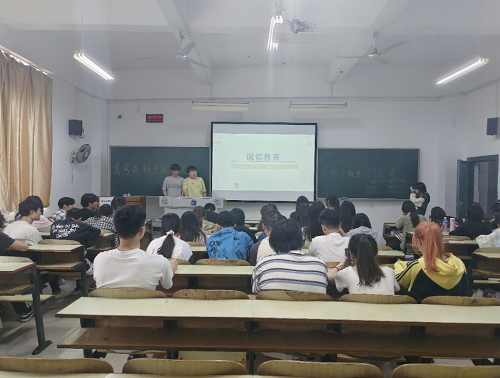 为弘扬优秀传统美德,根植诚信精神,传播0638太阳集团官网优良学风,经济学院组织各班于6月3日在主教学楼召开了“诚信铸魂,学海扬帆”主题班会,全体学生参加活动。