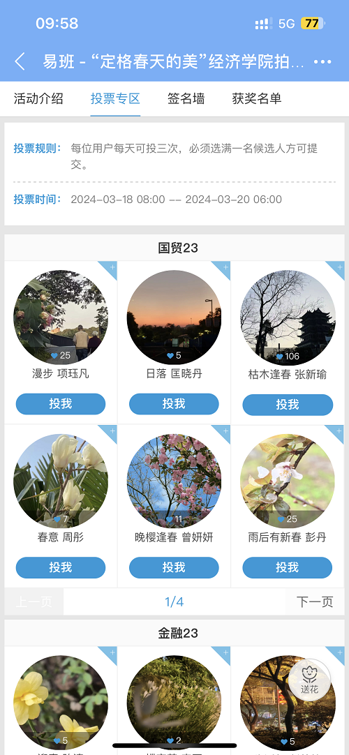 活动期间,同学们踊跃报名,积极投稿,通过摄影作品展现春天校园里的美景,生动地诠释了对美的理解。此次活动依托易班app平台开展,宣传部干部把参赛同学拍摄的照片上传至易班平台,开放投票通道,最终以票数决出本次比赛前六名,经济学2301班郭晨曦获得一等奖,经济学2101班陈美依、国贸2202班肖剑获得二等奖,经济学2301班成玉、金融工程2302班李欣欣和国贸2301班张新瑜获得三等奖,学院为获奖者颁发了证书与奖品,在全体同学的参与和配合下,本次活动圆满结束。