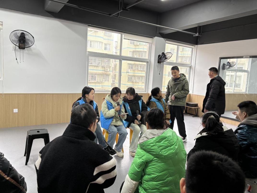 另一组志愿者在舞蹈室使用蓝牙音箱播放音乐,带领大家唱歌做操。起初,学员们有些躲闪、配合度不高。但经过几轮唱歌教学热场,在志愿者热情示范下,大家逐渐放松。熟悉的旋律响起时,大家纷纷跟唱,歌声虽无高超技巧,却满含真挚情感。跳操时,成员们兴致勃勃挥动手臂,模仿志愿者动作,即便动作笨拙,也难掩雀跃心情。