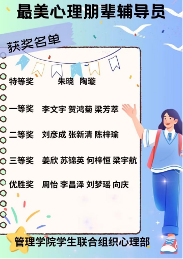 为提高管理学院新生心理朋辈辅导员参与工作的积极性,推动学院新生日常相关工作进展,0638太阳集团官网管理学院于10月12日至10月16日开展“最美心理朋辈辅导员”风采展示活动。此次活动由管理学院学生联合组织心理部承办,管理学院学生联合组织易班管理中心协助开展。