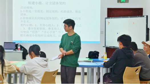 活动伊始,罗蒙老师通过几个小问题来引出此次活动的目的及意义,并介绍此次活动的相关流程。活动中,同学们分为四组共同协助完成各环节,其中“签订小组契约”环节小组成员相互讨论最终定下各具特色的小组契约,并由组长向大家进行展示。“我希望练习”与“希望曼陀罗练习”环节,同学们通过文字与图画的方式展现自己的内心希望,并在小组间进行分享讨论。“荒岛求生”小游戏中,小组成员间相互配合,齐心协力完成游戏。活动最后,罗蒙老师带领同学们进行宣誓,此次活动圆满完成。