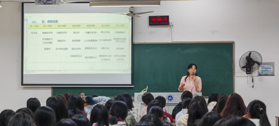 图为会计专业教研室主任王染老师进行专业介绍