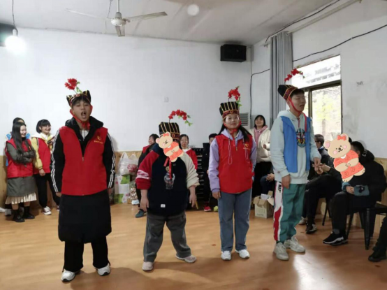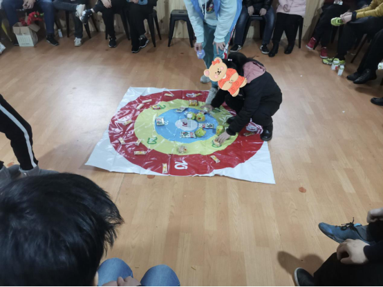 唱完歌后,志愿者和亲园的小伙伴们迎来了游戏时间。首先进行的是钓鱼吃东西,只见志愿者和亲园的小伙伴头上戴着帽子,在帽子上系着一根细绳,细绳上系着作为工具的零食,规则规定谁最后吃到就需要表演节目,这也让参赛者更加努力,现场的氛围也更加热闹。随后进行的游戏是丢沙包,由老师在有不同颜色圈层的大纸上放各种零食,而志愿者和亲园的小伙伴则需要将沙包丢到纸上,丢到哪个颜色里就可以拿走相应颜色里的零食,受到零食的吸引,亲园的小伙伴们都非常积极地参加,最后参赛的每个人都满载而归。