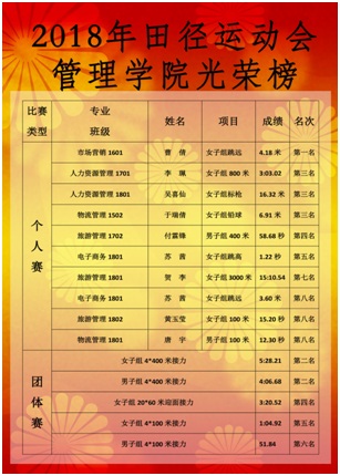 为期两天的运动会圆满结束,管理学院以优异的成绩为此次运动会交上了完美的答卷。在此次运动会中,管理学院赢得了女子团体四等奖、男子团体六等奖、管理学院团体六等奖、精神文明奖等多项荣誉,体现了管理学院齐心协力、不断拼搏的精神,相信在未来的路上,这种精神将会伴随管理学院的每一个人,在未来为管理学院赢得更多的荣誉!