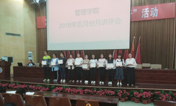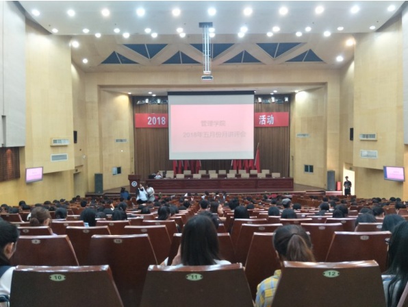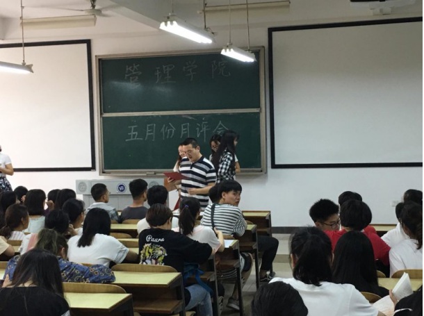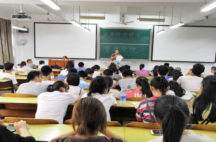 2018年5月3日中午12:00,管理学院大一大二大三全体同学、大四主要班委,在主校区教室内以及一报告厅内进行本学期第三次月评会议。学办辅导老师罗荃、黎博、单艳艳、包海燕、周艺、宋志航对工商管理、旅游管理、人力资源管理、会计学、物流管理、市场营销六个专业进行讲评。