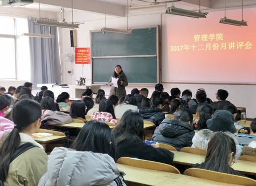 2017年12月12日中午12:10,管理学院大一大二双学号同学,大三班委,大四班长、学委、团支书,在主校区教室内进行本学期第四次月评会议。学办辅导老师罗荃、黎博、单艳艳、包海燕、周艺、宋志航对工商管理、旅游管理、人力资源管理、会计学、物流管理、市场营销六个专业进行讲评,本月心理会议也同月评会同一时间顺利展开。