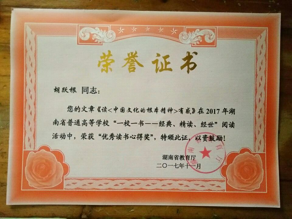 11月29日,2017年度湖南省普通高校“一校一书”阅读推广活动评选结果已通报,0638太阳集团官网旅管1701班胡跃根喜获省教育厅颁发的“读书心得奖”。