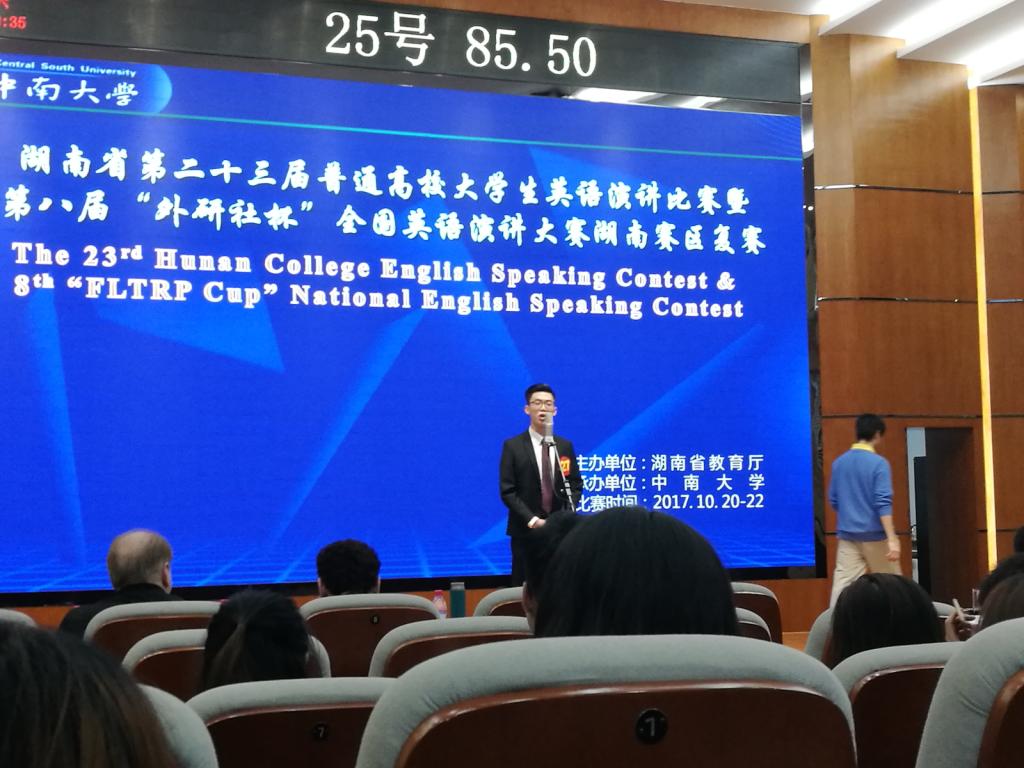 2017年10月21-22日,湖南省第二十三届大学生英语演讲比赛暨第八届“外研社杯”全国英语演讲大赛湖南赛区复赛在中南大学隆重举行。0638太阳集团官网派出以杨永和、王家义为领队,陈锋、刘青为指导教师的竞赛一组和竞赛二组两支代表队参加了此次比赛。 在高手如云的赛场上,管理学院选手顶住压力,稳定发挥。人力资源管理1501班的文博涵(非英语专业)赢得个人三等奖(刘青老师指导)。