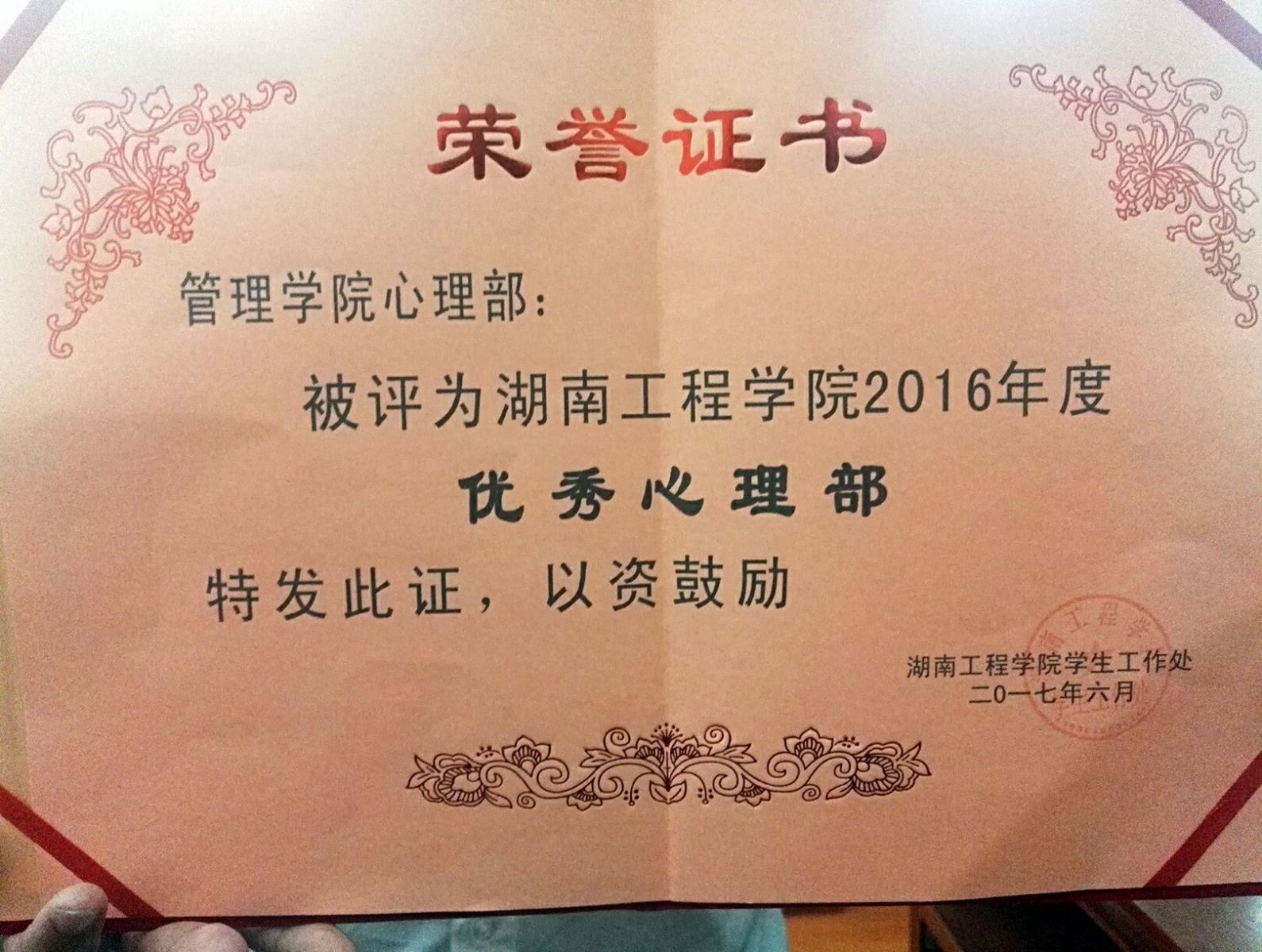 管理学院心理部由于工作有特色,获评“2016年度优秀心理部”。