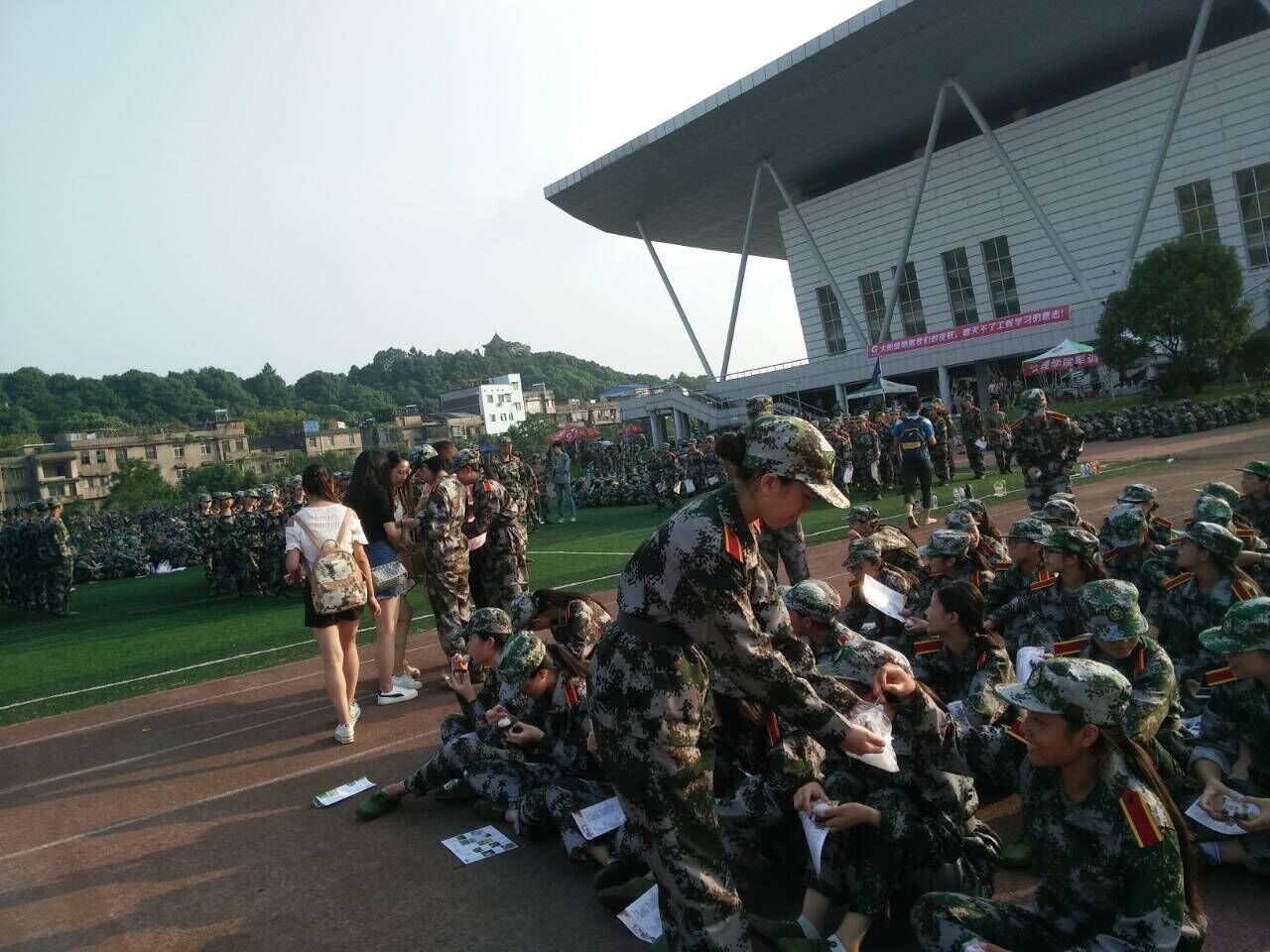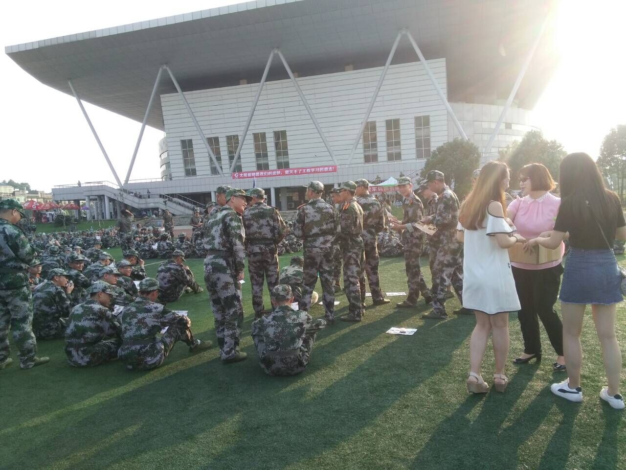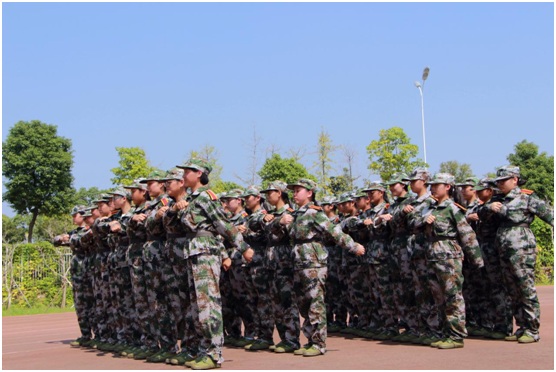 嘹亮的口号,激昂的歌声,整齐划一的动作,使体育馆顿时变得生龙活虎起来。入学的新生们换上迷彩服装穿梭在校园里,远远望去,犹如一道道跳跃着的音符。烈日当头,他们排着整齐的队列,迈着坚实的步伐,喊着嘹亮的口号,唱着雄壮的军歌。虽然军训生活是艰苦的,但再苦的生活也掩饰不住青春飞扬。站军姿、稍息、立正、齐步走、向右转,一句句嘹亮的口号鼓舞着他们前进,尽管很累,但是他们坚持着,在坚持的路上不仅培养了他们吃苦耐劳的精神,磨练他们坚强的意志,同时深深感受了团结就是力量。