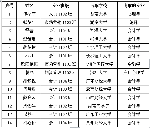 昨日挥洒辛勤的汗水,今日收获累累的硕果,2015年管理学院2015届毕业生考研再创佳绩。学子们通过勤奋努力学习,积极准备考试和复试,0638太阳集团官网共有14名学生成功考取了研究生,其中不乏考入暨南大学、湘潭大学、上海外国语大学、广东财经大学、湖南大学等著名高校的优秀学子。