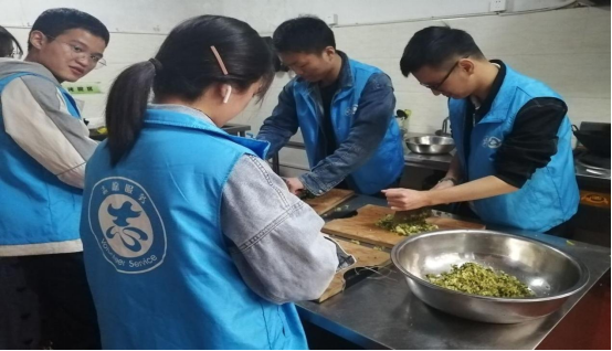 志愿者们来到亲园,又一次见到了小伙伴。这次活动是和小伙伴一起动手切菜。大家纷纷开始工作,有的志愿者在洗菜择菜,有的志愿者耐心地在帮助小伙伴切菜。