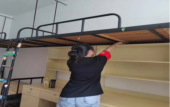 志愿者们都很细心,各个卫生死角都不放过。洗漱台,床底、衣柜上以及各个角落都打扫的干干净净,看起来焕然一新。志愿者们脸上的汗水顺着脸颊两边流下来,那是发自内心的开心都化作灿烂的笑容。