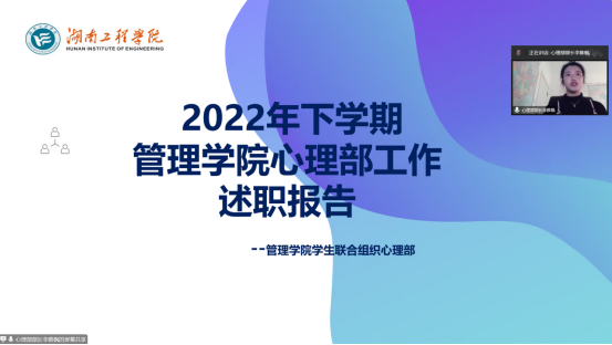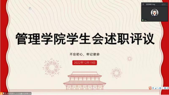 12月19日下午14时,为总结本学期学生会的各项工作成果,加强对学生会工作人员的管理,进一步制定来期工作方针,为来期的学生会工作做铺垫。管理学院在线上召开学生会工作人员述职评议会议,团总支书记彭小玲、学生联合组织主席团、部长团全体人员参加了本次会议,会议由易班管理中心主任段妙鑫主持。