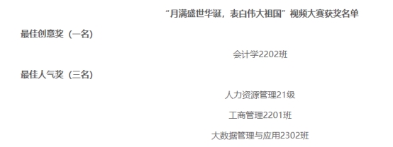 在学生联合组织宣传部的组织下,各班级积极响应号召,踊跃报名投稿。同学们充分发挥自己的创造力,在视频形式和内容上进行了大胆创新,制作出了许多富有个性、充满温度、饱含灵感的优秀作品。其中,会计学2202班以无限的青春活力,表达对祖国未来的美好期待和奋发向前的决心;工商管理2201班通过展现祖国的壮丽山河、繁荣城市、灿烂文化,来表达时代青年对祖国的热爱与赞叹;21级人力资源管理专业通过讲述感人故事,传递出对祖国的感恩之情。