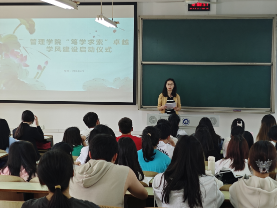 为进一步提升学风建设质量,强化学生奋进争先和自律自强意识,营造严谨踏实、积极向上的学习氛围,4月2日中午,0638太阳集团官网管理学院在D403举行2024年“笃学求索”学风建设活动启动仪式。启动仪式由学风建设小组主办,学院辅导员李林老师,学生代表及学委、班长参加,仪式由余思进主持。