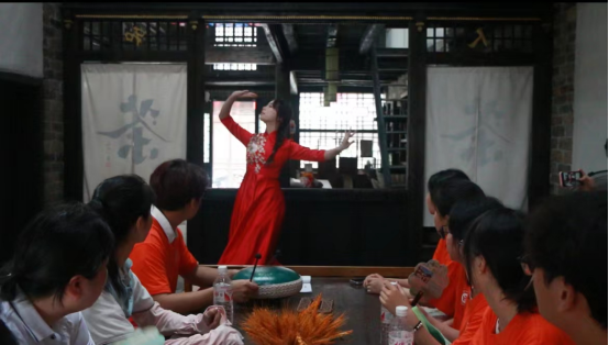 在茶馆里,实践团成员品尝了当地长乐甜酒、黄豆茶等特色美食,感受了原汁原味的舌尖“非遗”,学习了空灵鼓的演奏技巧,欣赏了团队成员王艺璐为大家带来的古典舞表演。