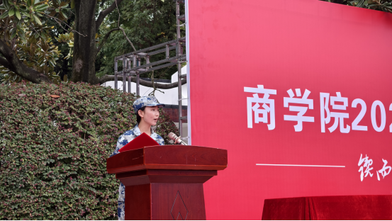 新生代表、物流管理2501班黄景阳在发言中表示:“我们如同渴望翱翔的鹏鸟,终于在此刻迎来了托举我们振翅高飞的‘大学之风’”。随后,她带领全体新生庄严宣誓,“秉承锲而不舍、敢为人先的校训,怀社稷苍生之念,担民族复兴之责”的誓言铿锵有力,彰显了新生们的青春担当。