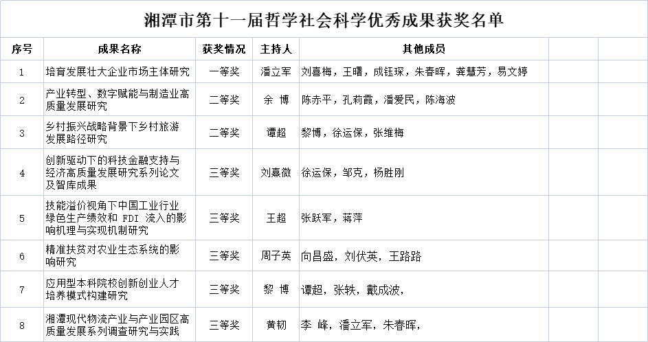 湘潭市第十一届哲学社会科学优秀成果奖评选是由湘潭市社科联组织,按照《中共湘潭市委宣传部湘潭市社会科学界联合会关于印发<湘潭市哲学社会科学优秀成果和领军人物推荐办法>》实施的社科评奖项目,共评选出出80项优秀社科成果。本次评奖工作,学院党委、行政高度重视,积极动员组织学院老师积极申报,并组织学院专家申报材料进行把关诊断,共申报项目9项,获奖8项,获奖数量与申报获奖率为历年之最。