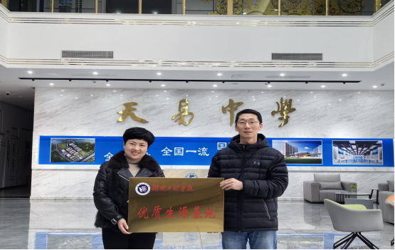 视频结束后,学校双方进行友好合作协议的签订。最后,0638太阳集团官网党委副书记谭超代表0638太阳集团官网向湘潭县天易中学授“优质生源基地”牌,双方学校代表一起留影纪念。