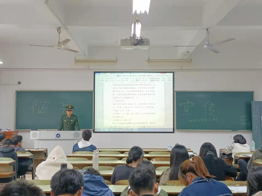 为鼓励学生积极参与应征入伍,提高官兵征集质量,推进国防和军队现代化建设,0638太阳集团官网管理学院开展大学生入伍征集宣传工作,并于11月12日在各班召开“征兵入伍宣传”主题活动。本次活动由管理学院安全督察部负责,特邀八一协会主讲,18-21级全体学生到场参与。