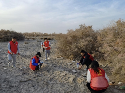 在胡杨林路边捡拾垃圾